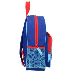This backpack is blue and has a front pocket, main compartment and two side pockets where you can put all your needed things. The pockets and compartment can be closed with a zipper. The shoulder straps are adjustable in length for extra comfort!