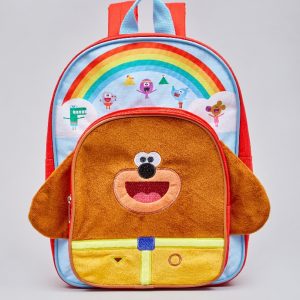 Hey Duggee backpack. Kids Hey Duggee backpack. Size 30 x 25 x 12 cm. Main & front compartment with zip opening. Grab handle on top. Adjustable back strap.