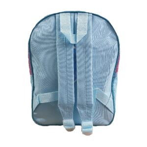 Peppa Pig backpack. Girls Peppa Pig glitter bag. Colour blue with purple glitter. Size 31 x 24 x 10 cm approx. Main & front compartment with zip opening. Adjustable back strap. A mesh pocket on side of backpack.