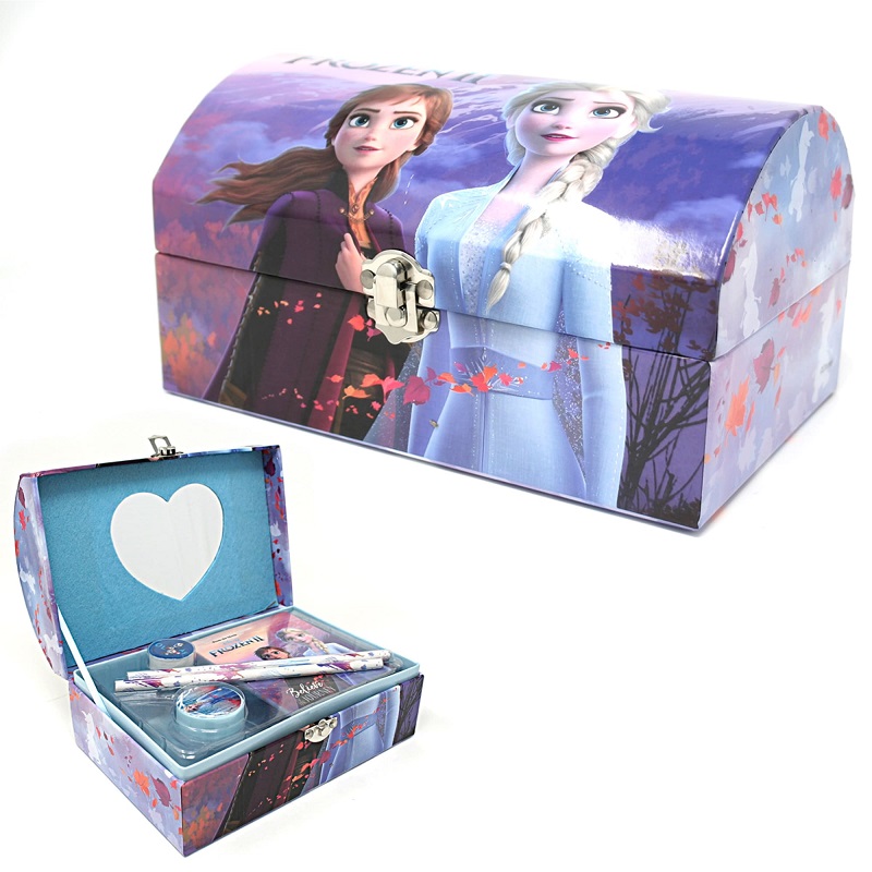 Frozen stationery set & jewellery box. Mirror in chest box. Made from a sturdy card composite, and can fastened shut with a metal clasp. Includes: 2 Pencils, 1 Sharpener, 1 Rubber, 1 Notepad. Box measures approx : 20cm x 13.5cm x 11cm.