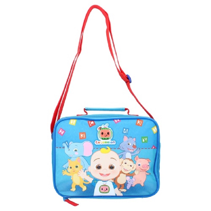Cocomelon lunch bag. Kids Cocomelon lunch bag. Adjustable shoulder strap & grab handle on lunch bag. One size of lunch bag is glossy Cocomelon picture. Zip opening.