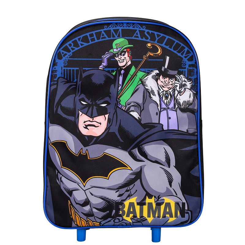 Batman trolley bag. Boys Batman travel trolley bag. Colour black. Size 42 x 29 x 14 cm approx (with legs). 2 wheels at the bottom. Extendable pull handle for easy transport. 1 main compartment with zip opening. Foldable trolley.