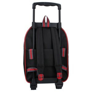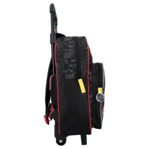 Children’s Disney Cars travel trolley bag. Colour black. Size 38 x 28 x 12 cm approx. Main & front compartment with zip opening. 2 wheels at the bottom to pull along. Extendable pull handle for easy transport.