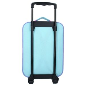 Frozen suitcase. Girls Disney Frozen travel bag. Colour blue. Size 42 x 32 x 11 cm approx. Extendable pull handle. 2 wheels at the bottom for easy transport. Grab handle on top.