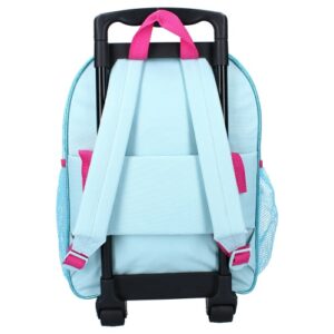 Children’s Disney Frozen II travel trolley bag. Colour blue. Size 38 x 28 x 12 cm approx. Main & front compartment with zip opening. 2 wheels at the bottom to pull along. Extendable pull handle for easy transport.