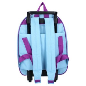 Frozen trolley backpack. Girls Disney Frozen travel bag. Colour blue. Size 33 x 25 x 10 cm. Main compartment with zip opening. Adjustable back strap. Can use on shoulder as a backpack. With wheels and legs to stand. Extendable pull handle. Grab handle on top.