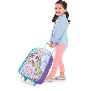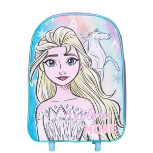 Frozen trolley bag. Girls Disney Frozen II travel trolley bag. Colour purple. Size 42 x 29 x 14 cm approx (with legs). 2 wheels at the bottom. Extendable pull handle for easy transport. 1 main compartment with zip opening.