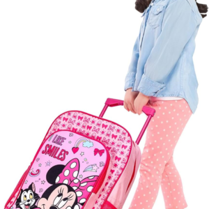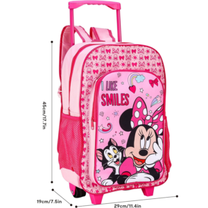 Minnie Mouse trolley backpack. Girls Disney Minnie Mouse travel trolley bag. Colour pink. Size 45 x 29 x 19 cm approx. Large & front compartment with zip opening. 2 wheels at the bottom to pull along. Extendable pull handle for easy transport. 2 mesh compartments on side of the trolley.