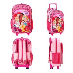 Princess trolley backpack. Girls Disney Princess travel trolley bag. Colour pink. Size 45 x 29 x 19 cm approx. Large & front compartment with zip opening. 2 wheels at the bottom to pull along. Extendable pull handle for easy transport. 2 mesh compartments on side of the trolley.