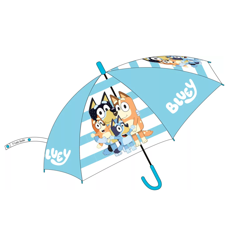 Bluey umbrella. Kids Bluey umbrella you’ll stay nice and dry! This transparent umbrella has 8 metal ribs. Through the transparent screen you always see where you are walking. Let it rain! Size 74 cm approx.