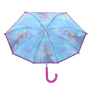 Real princesses don’t walk in the rain… so your little girl refuses to get wet in her princess outfit. With this Frozen umbrella, the rain won’t stop your little princess. On the contrary, I’m sure she can’t wait to walk to school under the umbrella. Don’t be surprised if she uses it as an umbrella too. The umbrella is light blue and has pink accents. The round handle and the protective caps at the bottom of the boning supports are pink. On the umbrella we see Elsa and Anna; they protect your daughter from the raindrops. Size 63 x 70 x 70 cm.