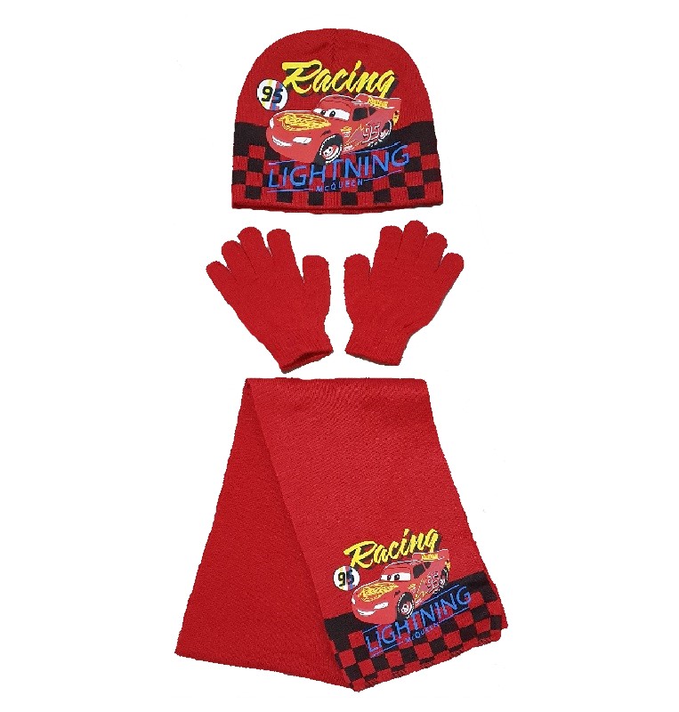 Cars hat, gloves & scarf. Boys Disney Cars Lightning McQueen winter hat set. 2 colour available red & blue. Age 3-8 years. Material acrylic.