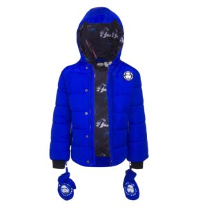 Star Wars jacket. Boys Star Wars winter jacket with gloves. Image on gloves. Age 4-10 years. Zip opening. 2 colours available grey & blue. Material polyester. Printed inner lining.