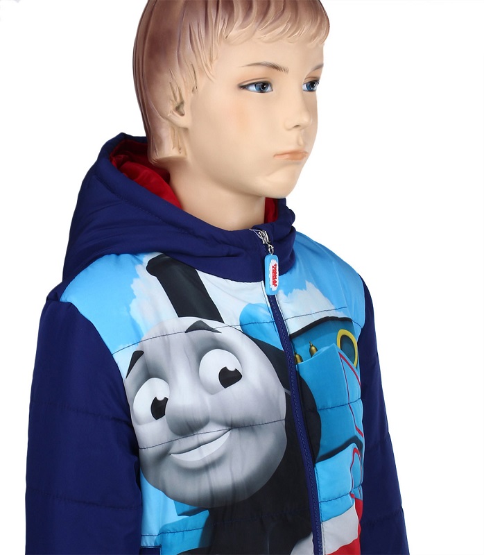 Thomas jacket. Boys winter Thomas And The Tank Engine jacket. Colour navy. Age 2-6 years. Material 100% polyester. Inner lining polyester. Front zip opening. With 2 pockets. Front Thomas print and back plain.