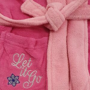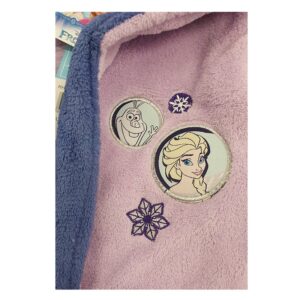 Frozen dressing gown. Official licence product. Girls Disney Frozen robe. Material fleece polyester. 2 colours available pink and purple. Age 4-8 years. 2 pockets in front of gown. Embroidery on 1 pocket and left side of gown.
