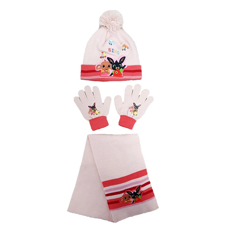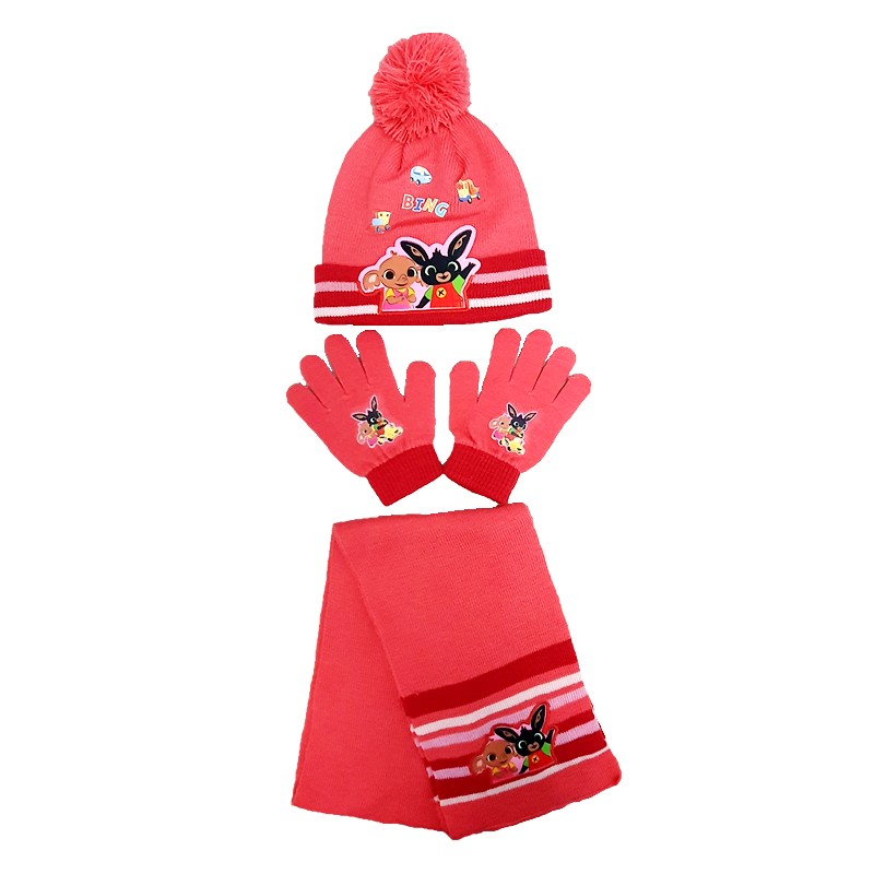 Bing hat, gloves & scarf set. Girls Bing winter 3 piece hat set. 2 colours available coral & light pink. One size, fits age 3-8 years. Material acrylic.