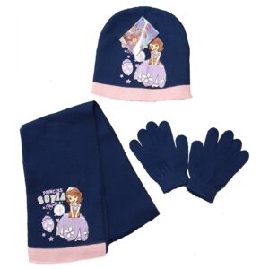Sofia hat, gloves & scarf set. Girls Disney Sofia The First winter 3 piece hat set. Age 3-8 years, size 52 & 54 cm. 3 colours available pink, cream & navy. Material acrylic. Print on hat & scarf.
