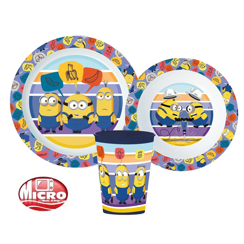 Minions dinner set. Without cardboard box. Material microplastic. The set contains: 1 bowl, 1 plate & 1 cup (260ml). Microwaveable max 2 minutes, please see label on dinner set.