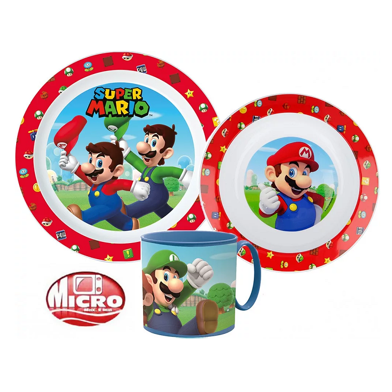 Super Mario dinner set. Kids Mario dinner set. Without cardboard box. Material microplastic. The set contains: 1 bowl, 1 plate & 1 mug (265 ml). Microwaveable max 2 minutes, please see label on dinner set.