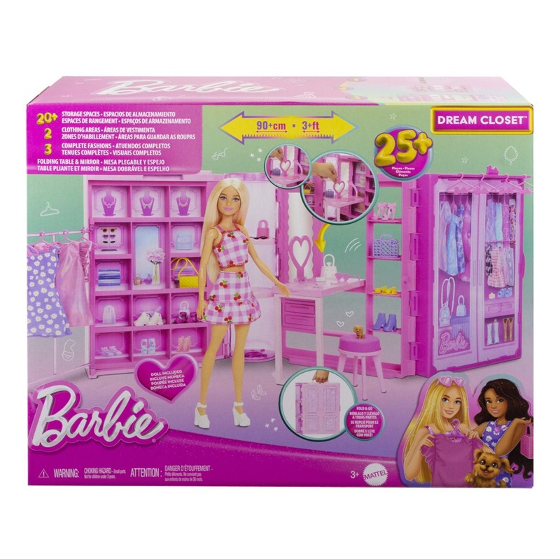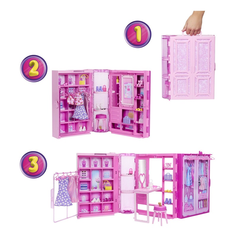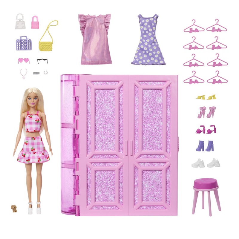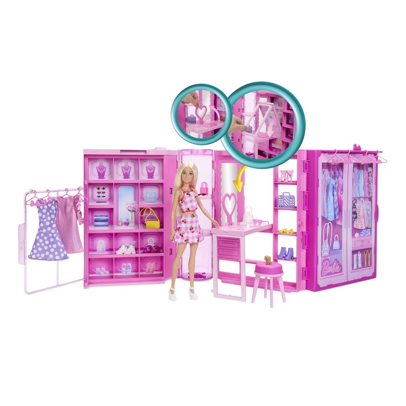 • The glittery pink wardrobe opens to a 3-foot-wide playset featuring a Barbie fashion doll, 25+ pieces, 20+ storage spaces, 2 clothing racks, a shoe wall, and more.