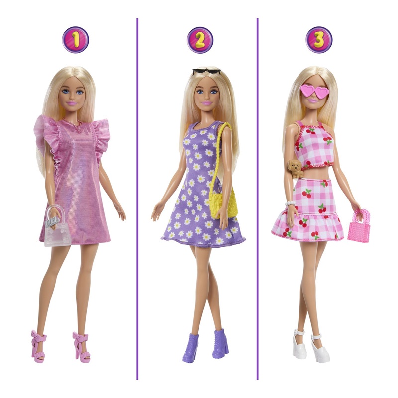 • Barbie doll has 3 complete outfits featuring a party dress, sundress, two-piece outfit.