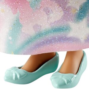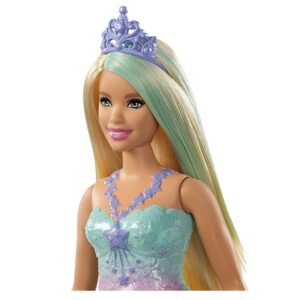 Barbie Dreamtopia princess doll. Official licence product. Dressed in a rainbow-themed outfit, this Barbie doll brings colour to playtime storytelling. A Barbie Princess doll wearing a colourful top decorated with a star-shaped necklace, a removable skirt that shimmers with a print of rainbows, stars and unicorns and matching teal shoes. This princess doll girls toy has a tiara that adds even more colour to her blonde hair streaked with blue. Box size: 11.43 x 5.4 x 32.39 cm. Age 3+.